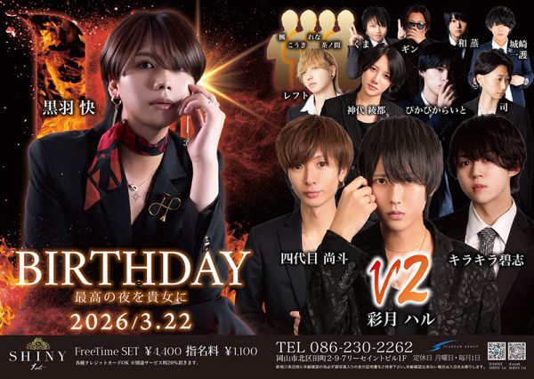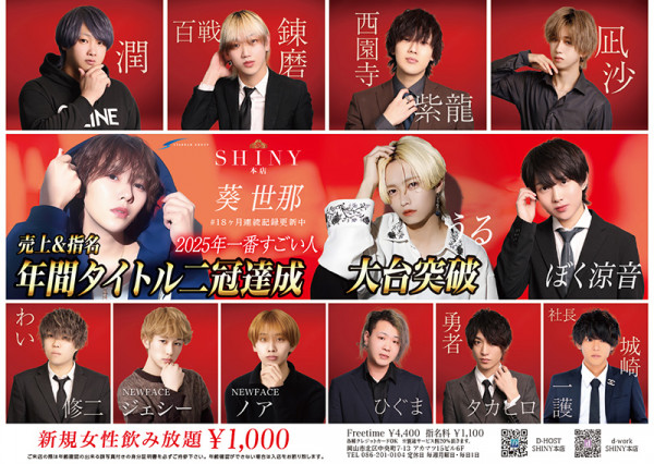 CLUB shiny本店 シャイニーホストクラブ岡山を代表するホストクラブ「シャイニー本店」へようこそ。洗練された空間で、個性豊かなホストたちが最高のおもてなしとエンターテインメントを提供します。スタイリッシュで豪華な店内で、非日常の贅沢な時間をお楽しみください。ビギナーの方も安心して楽しめるアットホームな雰囲気と、心に残る特別な体験をお約束します。岡山の夜を彩る「シャイニー本店」で、極上のひとときをお過ごしください。岡山市北区中央町7-13アカマツ15ビル6F