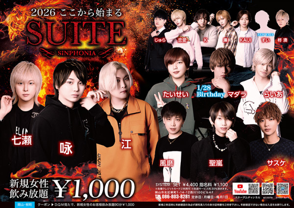 SUITE スイートホストクラブ優雅で落ち着いた空間を提供するホストクラブ「スイート」へようこそ。洗練されたホストたちが、心を込めたおもてなしと上質な時間をお届けします。スタイリッシュでラグジュアリーな店内は、大人の隠れ家のような雰囲気で、リラックスしながら贅沢なひとときをお楽しみいただけます。喧騒を忘れて、ゆっくりと流れる時間を「スイート」で。特別な夜を、落ち着いた優雅な空間で過ごしてみませんか?岡山市北区柳町1-14-12西川100ビル4F