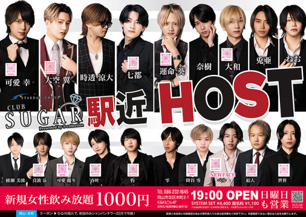 CLUB SUGAR シュガーホストクラブ勢いが止まらない岡山のホストクラブ「シュガー」へようこそ!魅力的なホストたちが、圧倒的なエンターテインメントと最高のおもてなしで、あなたを特別な夜へと誘います。活気あふれる雰囲気の中、甘く贅沢な時間を楽しむことができる「シュガー」は、ビギナーからリピーターまで誰もが夢中になること間違いなし。岡山の夜を盛り上げる最強のスポットで、忘れられない体験をぜひ味わってください。岡山市北区本町2-1 K&Kビル4F