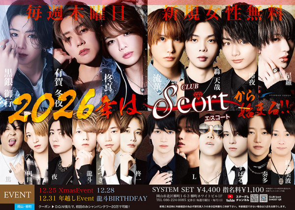 CLUB Scort エスコートホストクラブ岡山最大級のホストクラブ「エスコート」へようこそ。豪華でスタイリッシュな空間で、洗練されたホストたちがあなたを特別な世界へとエスコートします。エンターテインメント性あふれるおもてなしと、上質なドリンクメニューで、非日常のひとときをお楽しみください。特別な時間を過ごしたい方や、初めての方でも安心して楽しめる空間をご提供いたします。最高のサービスと贅沢な夜を「エスコート」で体験してください。岡山県岡山市北区柳町1-6-3柳町ホワイトビル1F